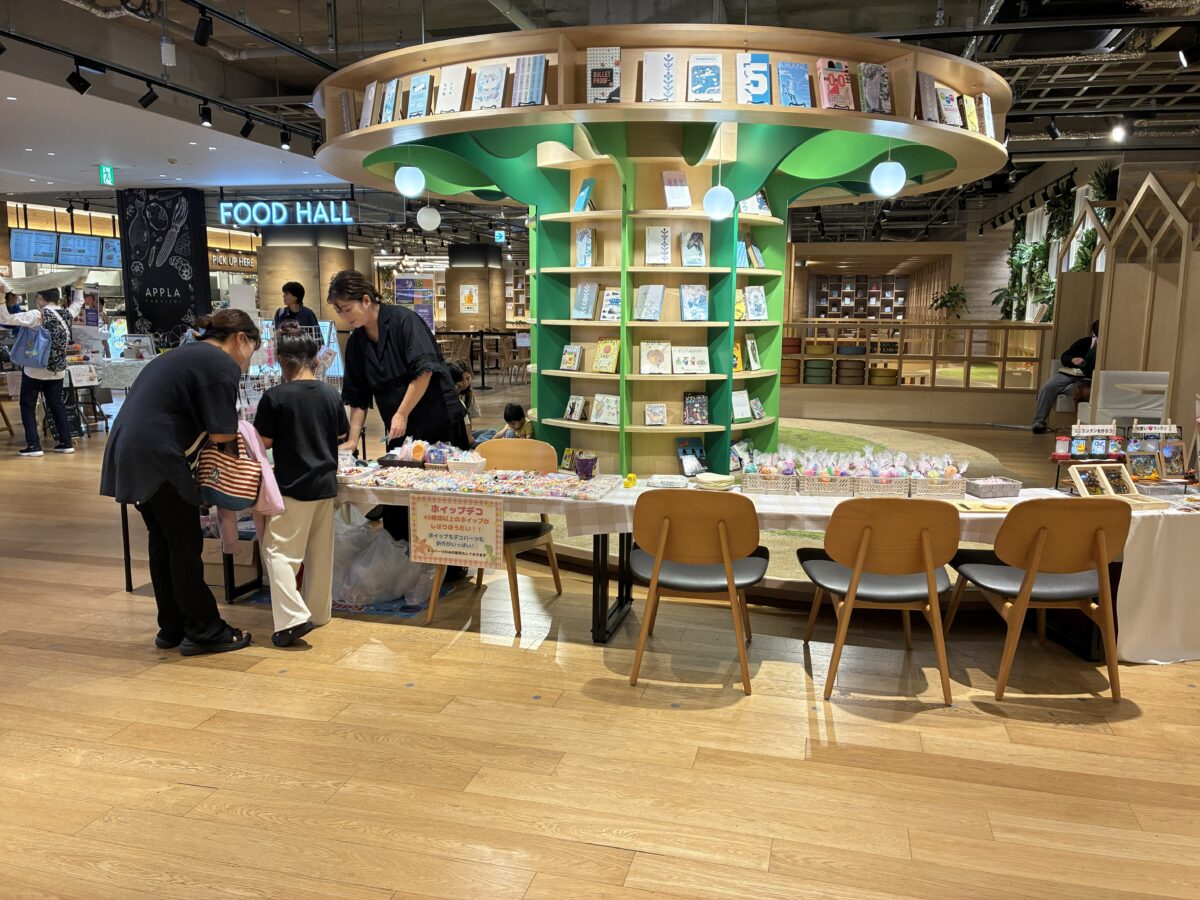 絵本売場の前の広々としたスペースです。カフェや施設のフードコート、共用スペースが周りにあるため、360度さまざまな角度から足を止めてもらうことができます。